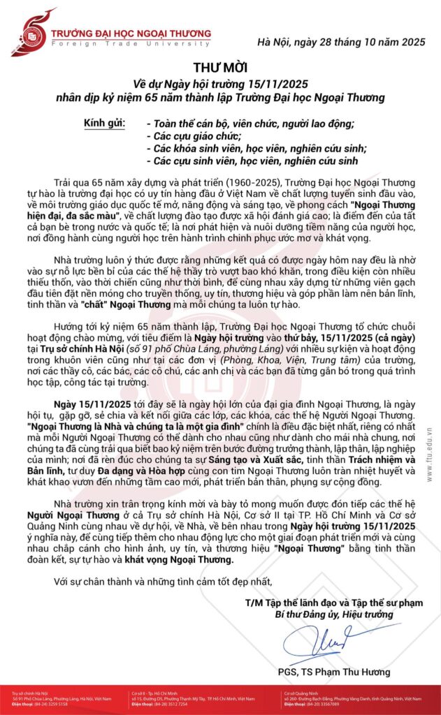 Ngày 28/10/2025, với sự chân thành và những tình cảm tốt đẹp nhất, Hiệu trưởng Trường Đại học Ngoại Thương đã ký Thư mời, trân trọng kính mời và bày tỏ mong muốn được đón tiếp các thế hệ Người Ngoại Thương ở cả 3 cơ sở cùng nhau về dự hội, về Nhà, về bên nhau trong Ngày hội trường 15/11/2025 (thứ bảy) tại 91 phố Chùa Láng – phường Láng – TP Hà Nội, để cùng tiếp thêm cho nhau động lực cho một giai đoạn phát triển mới và cùng nhau chắp cánh cho hình ảnh, uy tín, và thương hiệu “Ngoại Thương” bằng tinh thần đoàn kết, sự tự hào và khát vọng Ngoại Thương.